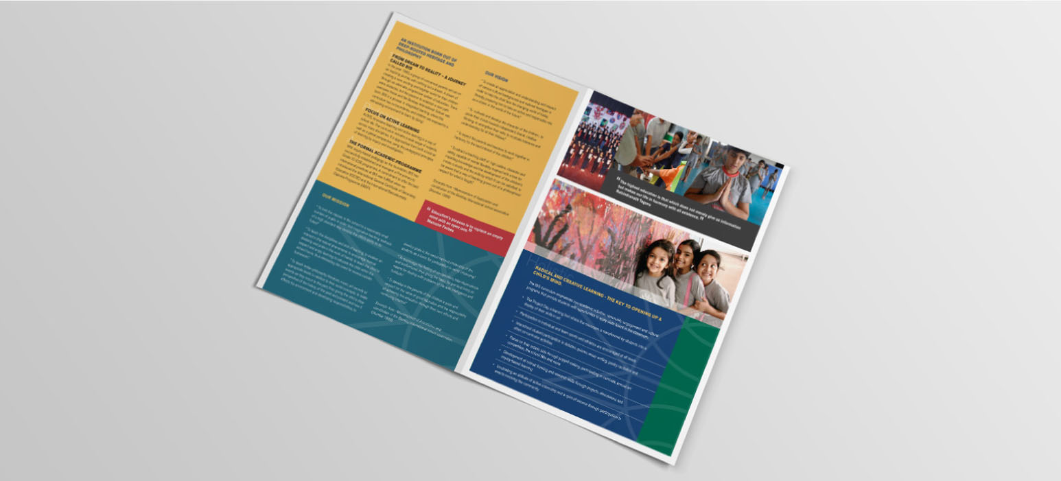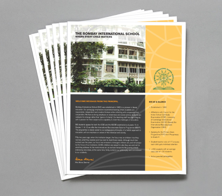 Bombay International, also popularly known as BIS, wanted a fresh communication tool to connect with parents. Being a 30 year old institution, BIS was in the process of setting a new age curriculum through the IBDP program. Mindseye developed a new school brochure using vibrant colors and contemporary designs. The design approach included a visual language which would appeal to new age parents and communicate the future outlook of the school as well. The end deliverable included adapting the print design for their website as well there ‘cutting across media’ to provide a complete solution.