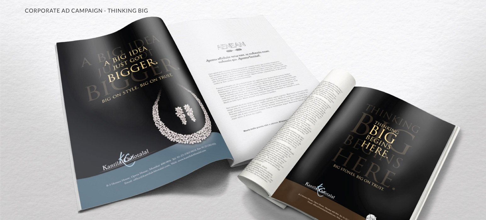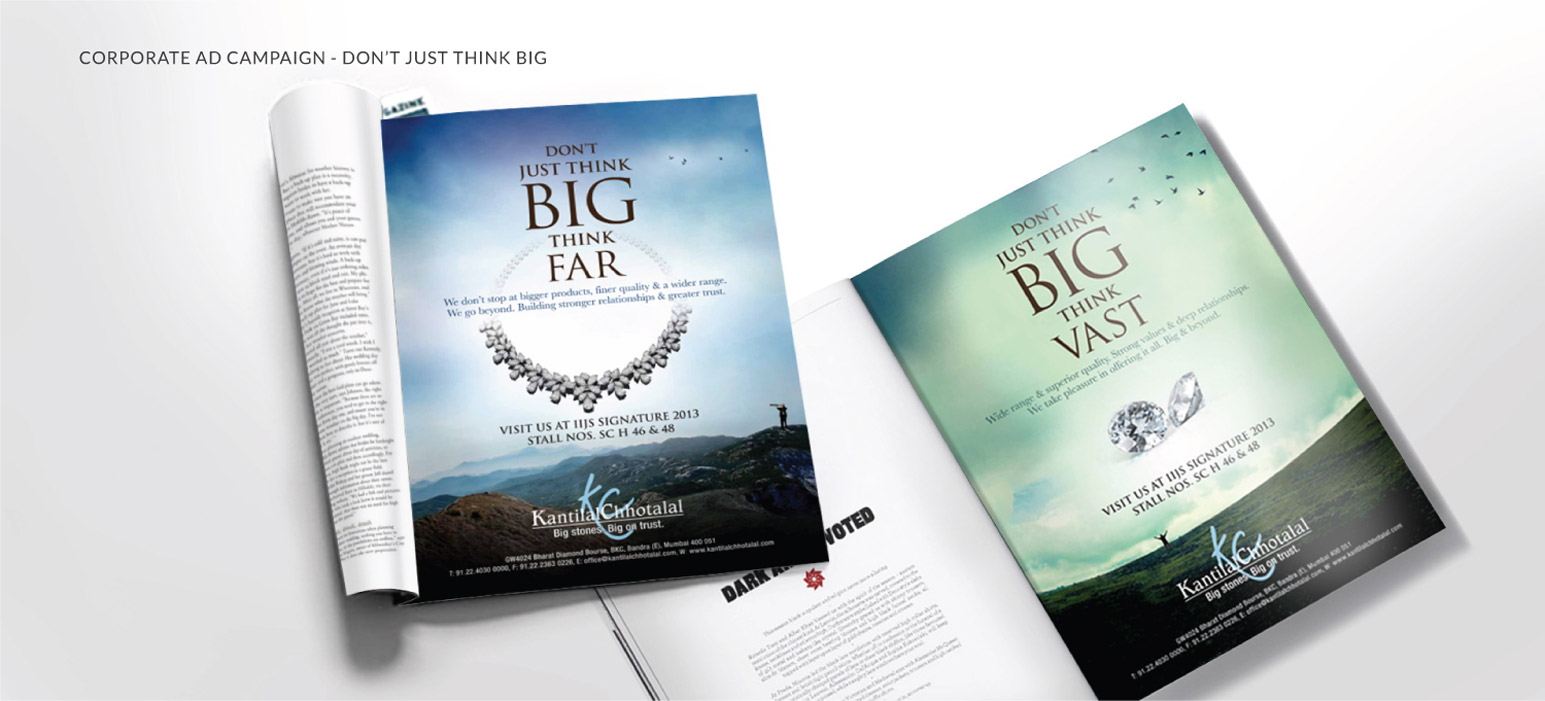 Kantilal Chhotalal is a wholesaler of solitaires and solitaire jewelry. While its heritage is well know in the industry, it wanted to expand its marketing and distribution across the global. The key challenge was to create a strong, minimalist ad campaign which spoke about the brand and its values. Having a strong product story and market positioning, the challenge was to create as much brand awareness and call to action as possible. The ‘Thinking Big’ campaign was their main stay communication tool until recently which is when it was extended to ‘Don’t Just Think Big’ campaign. Combined these campaigns have been running over the last 8 years.